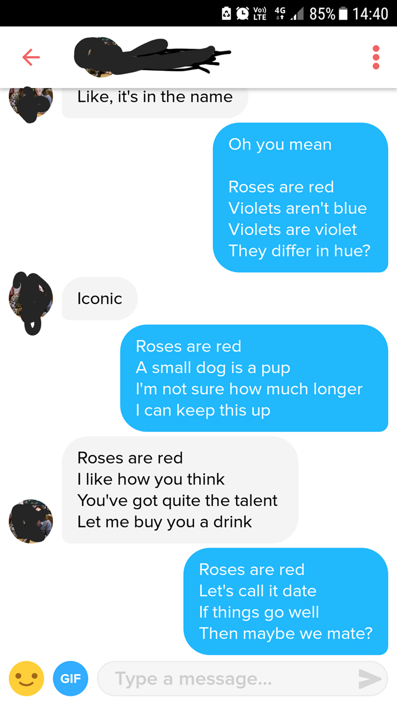 And its a sign of the times. Roses are red violets are blue Instagram is down the Facebook will do. WasterofTime messaged a Tinder match using a bit of original poetry.